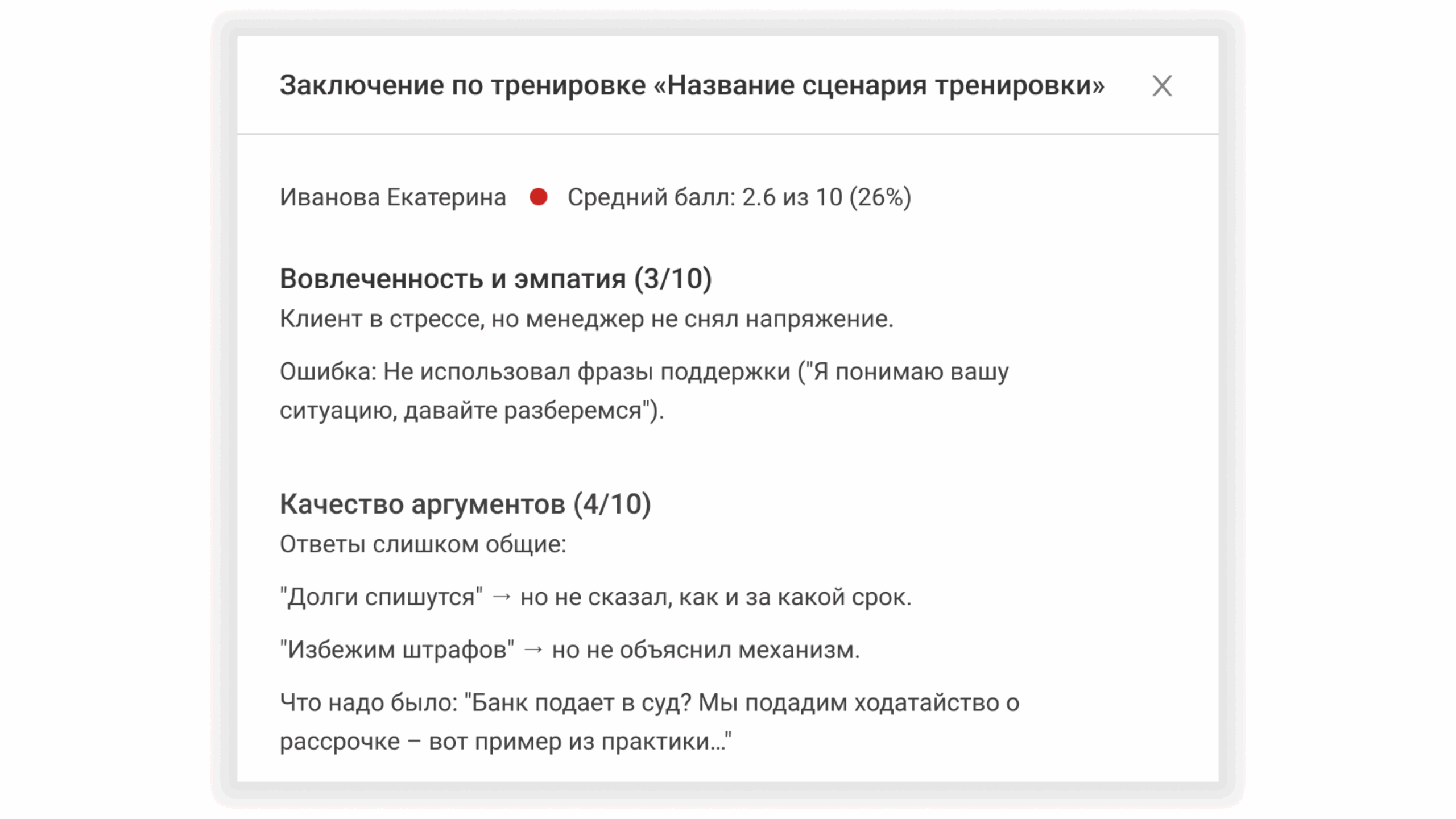 Отчёт в Скорозвон AI-тренере включает в себя разбор диалога, как сотрудник общался с виртуальным «клиентом». В отчёте отражены оценки по нескольким критериям, допущенные ошибки и рекомендации по улучшению, например:
