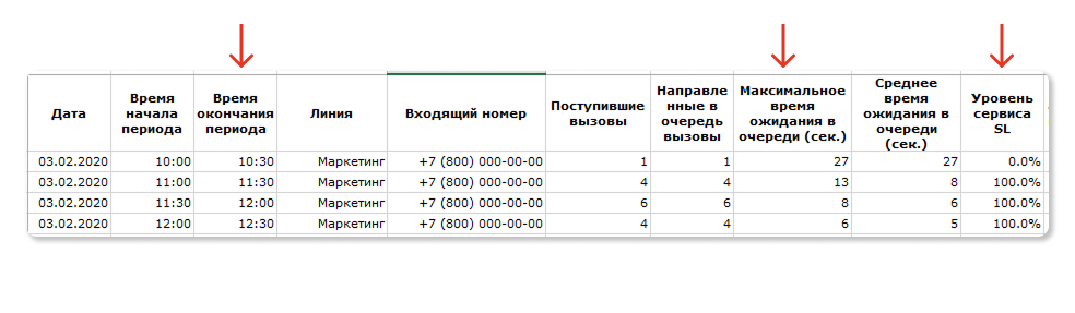 Чтобы более подробно проанализировать картину, используйте отчёт «Входящие вызовы». В выгрузке «Показатели линии» отражён не только Service Level* по каждому получасовому интервалу работы, но и другие данные: