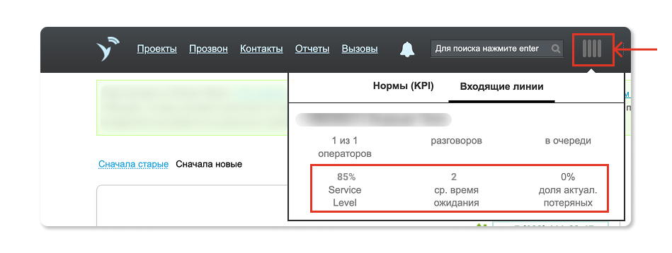 В упрощённом виде — в разделе «Входящие линии» в шапке сервиса (наведите курсор на шкалу справа от поля поиска). Здесь же отображается количество операторов на линии, среднее время ожидания и доля потерянных вызовов.