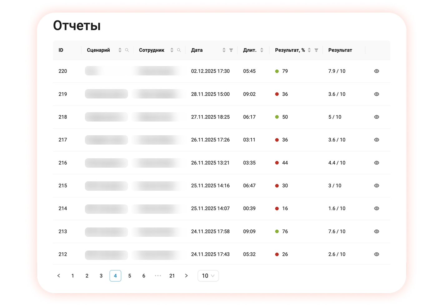 Числовой отчёт по сотрудникам, который предоставляет AI-тренер: