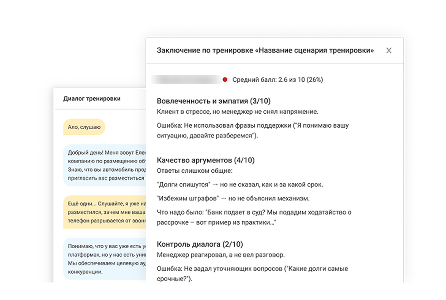 В отчёте представлены не только числовые показатели, но и детальные пояснения к выставленной оценке. Тренер выставляет баллы от 1 до 10 (с округлением до десятых) по нескольким критериям, а в каждом из них отдельно отмечает расхождения между ожиданиями ИИ и фактическими ответами сотрудника, показывает детальные рекомендации.