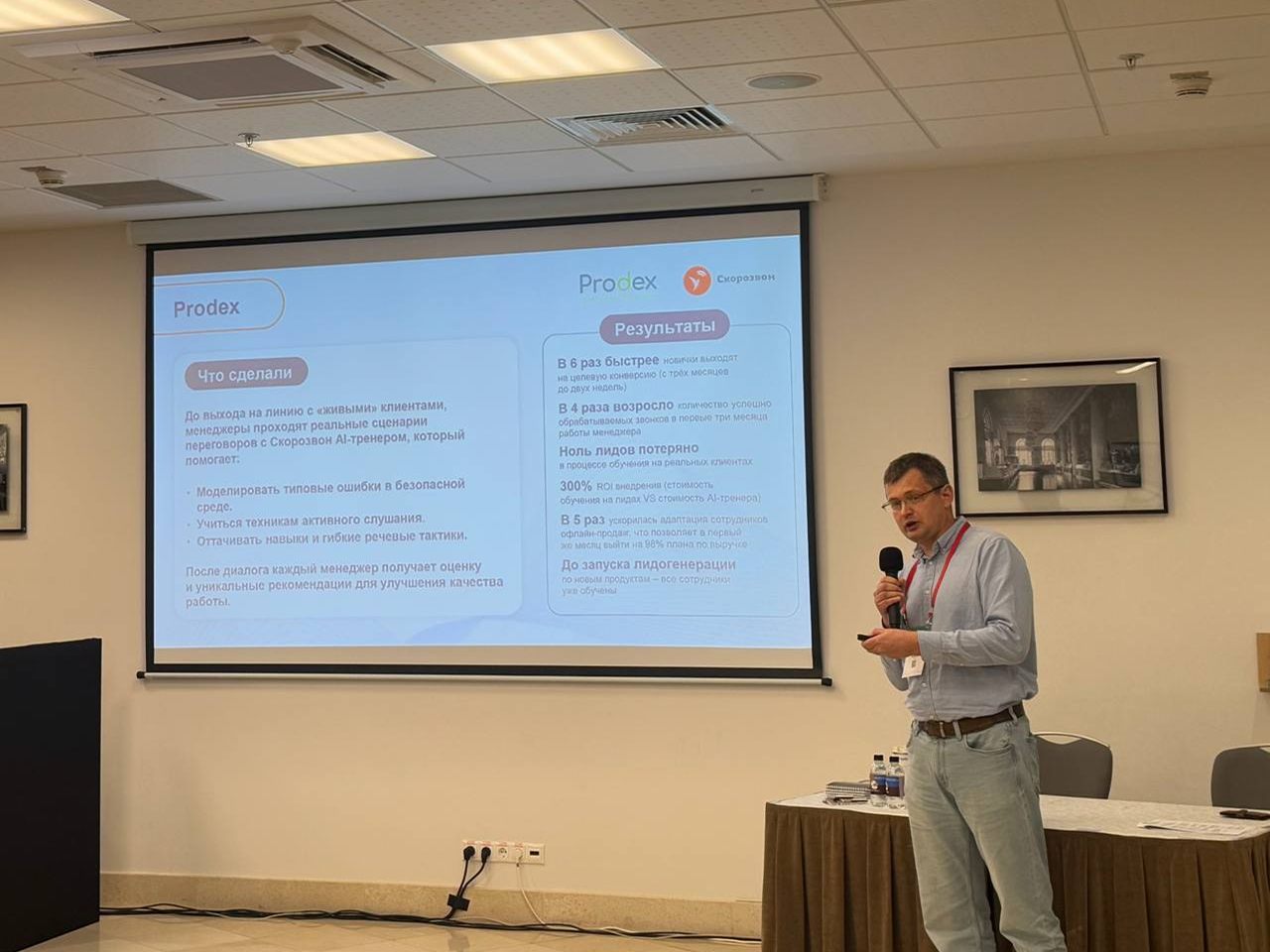 28 октября Михаил Шварцбурд, руководитель по развитию AI-продуктов сервиса «Скорозвон», и Максим Черединов, директор департамента прямых продаж Prodex, выступили с презентацией на Customer Contacts Week — месте встречи руководителей и ключевых менеджеров контакт-центра.