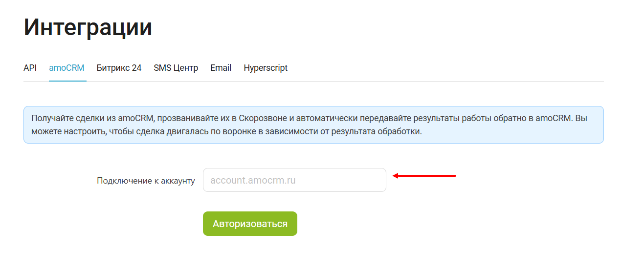 Введите название вашего аккаунта amoCRM без https:// и нажмите «Авторизоваться».