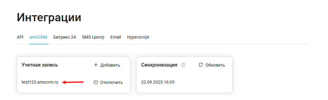 Таким образом, вы подключили аккаунт amoCRM к Скорозвону. Можете переходить к настройкам. - После подключения аккаунта появится страница с данными о подключенном аккаунте с возможностью отключить этот аккаунт или добавить еще один аккаунт.