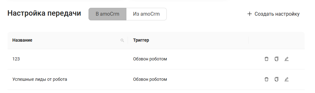 В таблице настроек отображаются все существующие настройки. Можно выполнить следующие действия: удалить, скопировать или редактировать.