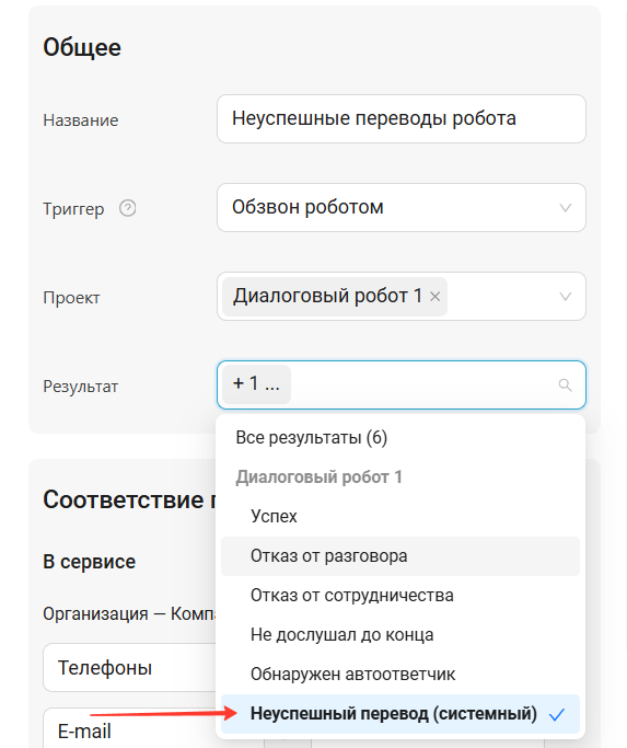 Сервис автоматически назначает переведенному звонку результат «Неуспешный перевод (системный)».