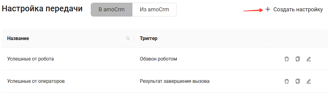 - Перейдите в меню: Интеграции → Создать или Редактировать существующий профиль интеграции с CRM.