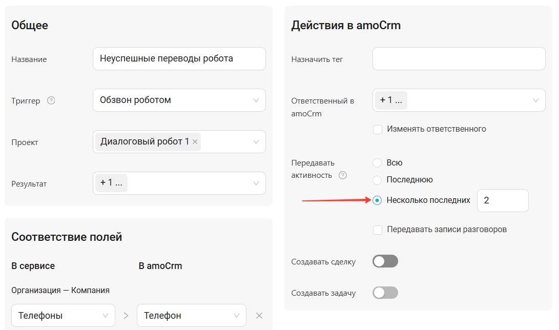если вы хотите передавать в CRM оба звонка (и исходный от робота, и попытку перевода), выберите в настройке «Несколько последних» и укажите значение «2» (две последние активности).