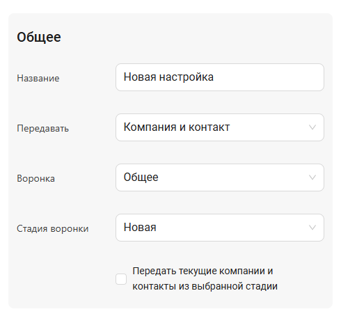 - для компании и контакта — воронка и ее стадия. - Если нужно передать в Скорозвон не только новые сущности, но и существующие контакты или лиды, тогда установите чекбокс «Передать текущие компании и контакты из выбранной стадии» или для лидов чекбокс «Передать текущие лиды в статусе».