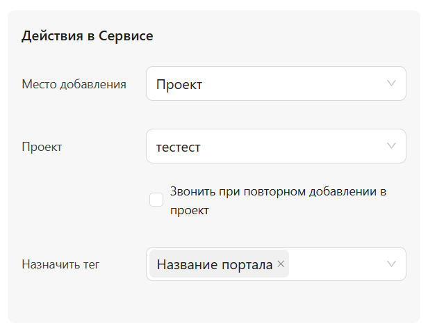 Проект — выберите из списка проект или проект обзвона роботом, в который будут добавлены контакты и лиды для автоматического обзвона.