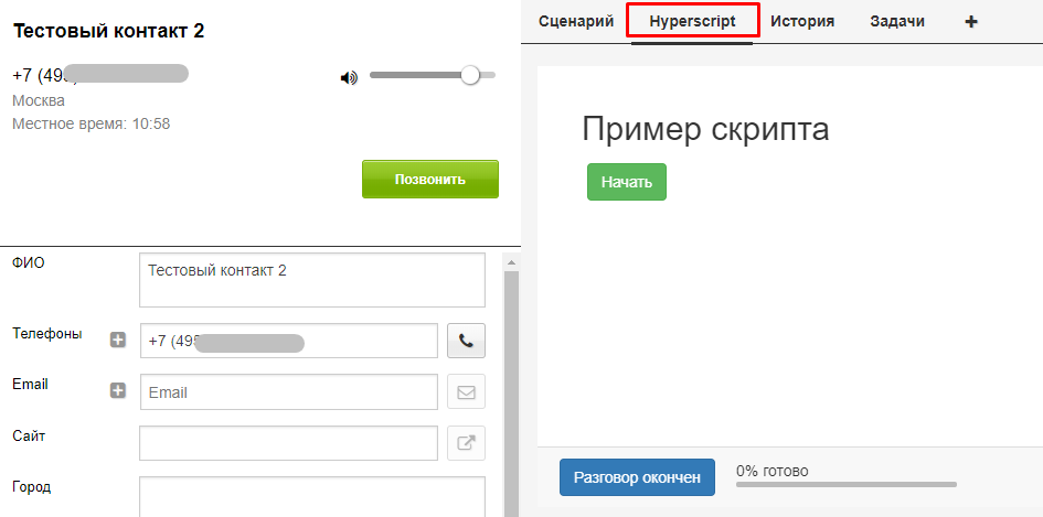 Теперь в карточке звонка у указанных сценариев появилась вкладка «Hyperscript», при нажатии на которую открывается форма с вашим скриптом.