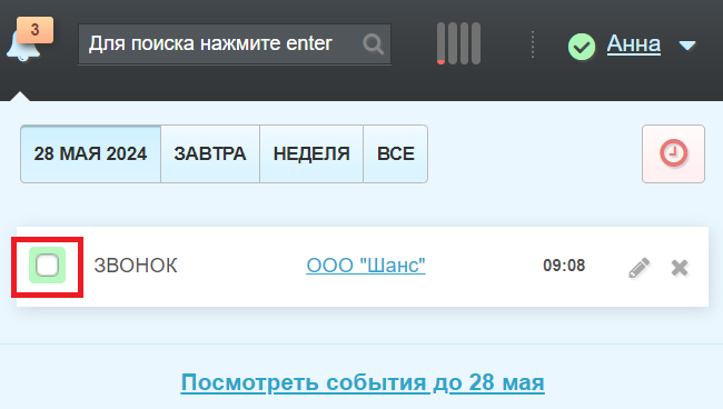 Если нажать на галочку, то в установленное время оператору придет уведомление о том, что необходимо позвонить клиенту. После совершения звонка задача автоматически завершится.