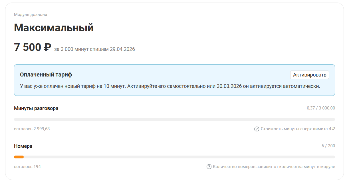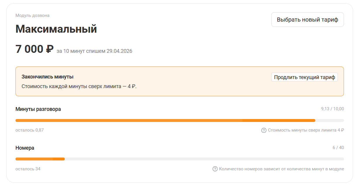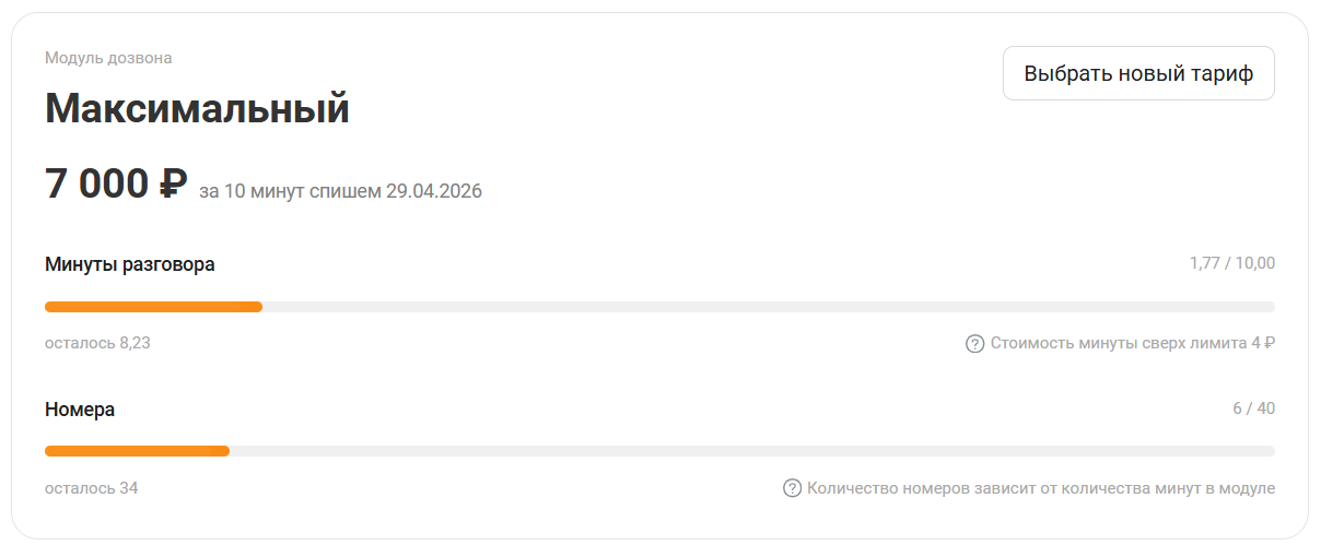 Остатки минут и номеров показываются динамически: как вы совершаете звонки или загружаете номера — они автоматически обновляются.