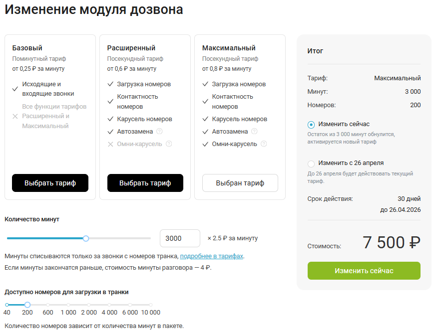 Установите нужное количество минут с помощью слайдера (или введи вручную). Система автоматически пересчитает лимит номеров согласно тарифной сетке. На экране сразу видна новая итоговая стоимость, сроки следующего списания и все лимиты.