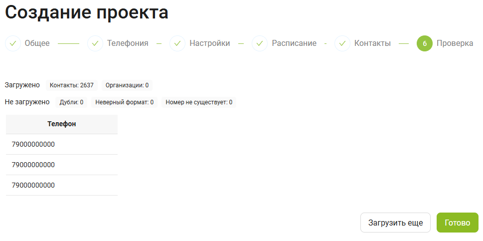 После нажатия «Начать загрузку» номера добавляются в проект. Можно дозагрузить ещё номера или завершить загрузку и начать обзвон по проекту.