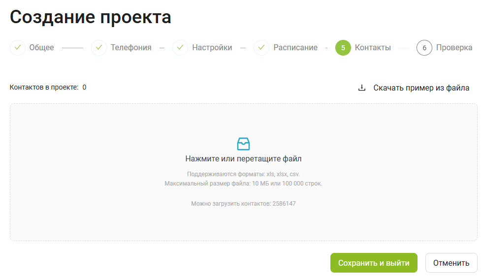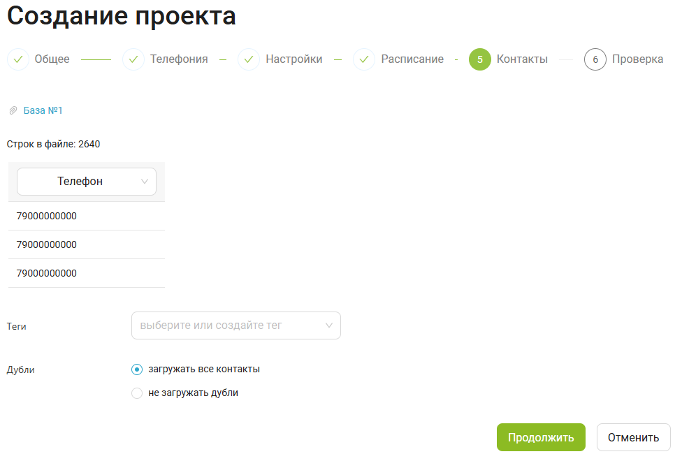 - Загрузить номера без проверки. Номера будут загружены в проект без проверки на контактность.