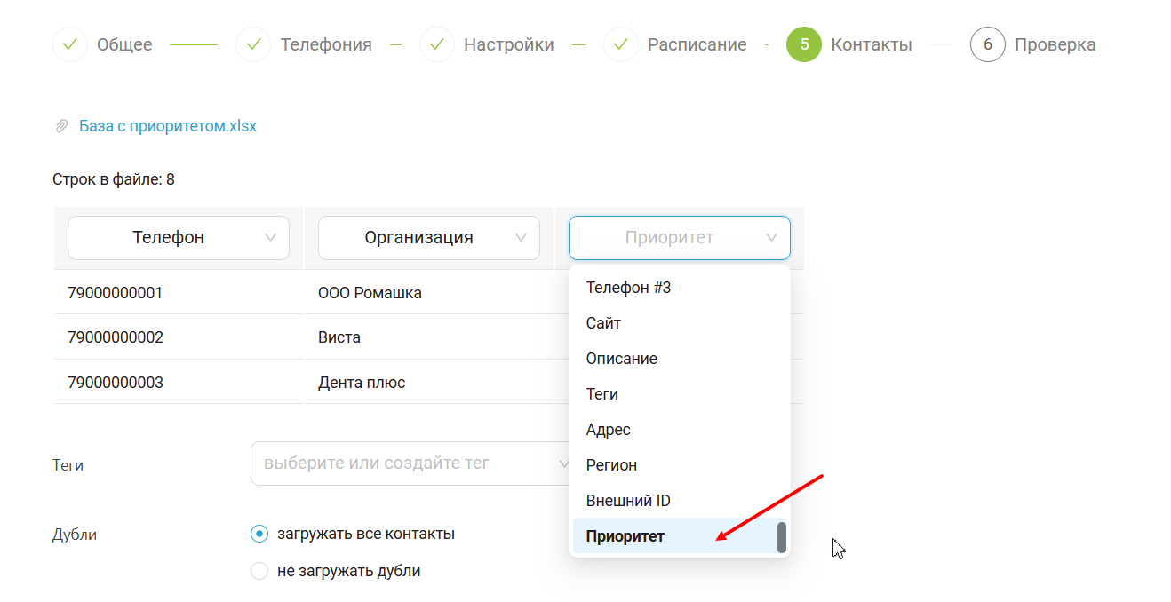 Подготовьте файл с базой контактов, установив значение приоритета напротив каждой строки. Допускается значение приоритета от 1 до 10 целым числом.