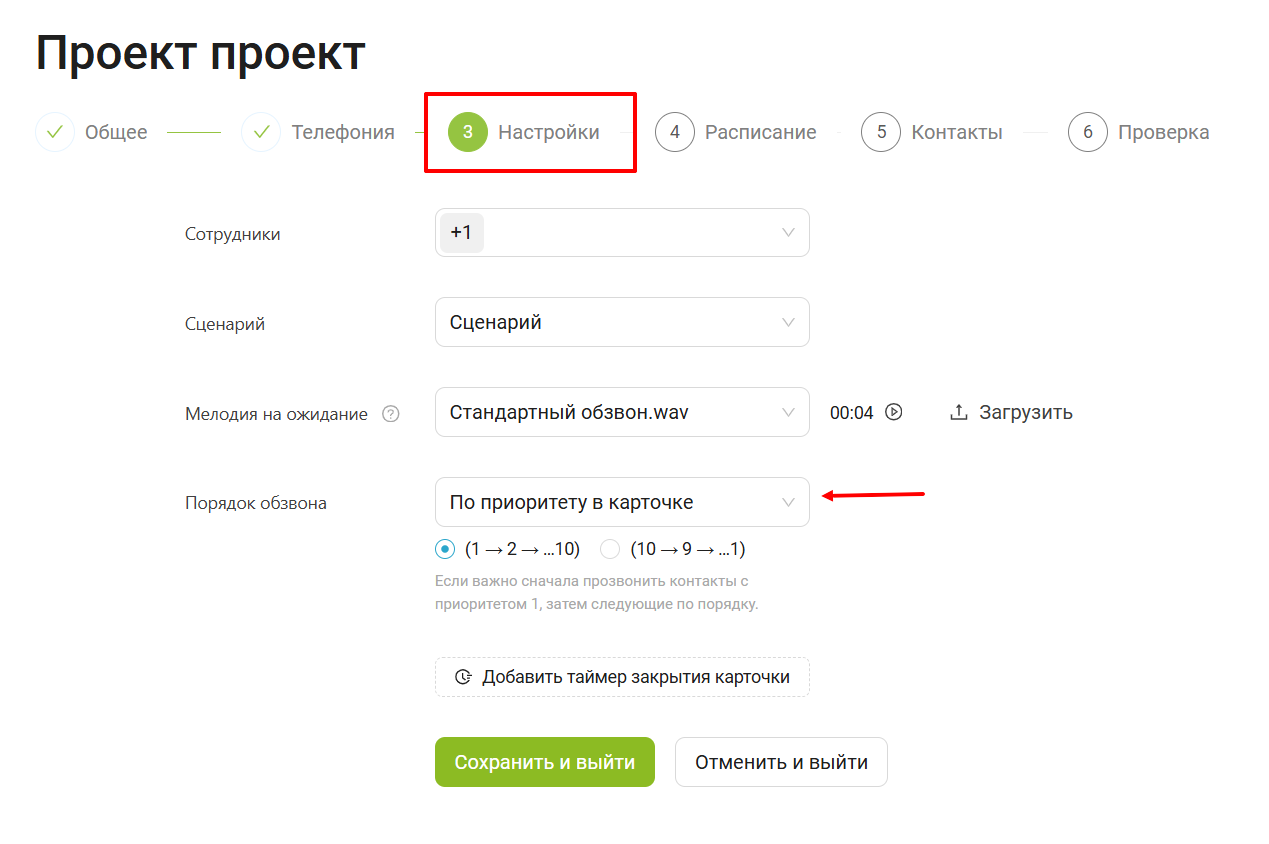 При создании или редактировании проекта, перейдите в настройки и в пункте порядок обзвона выберите «По приоритету в карточке». Установите сортировку обзвона по возрастанию или по убыванию в зависимости от вашей задачи.