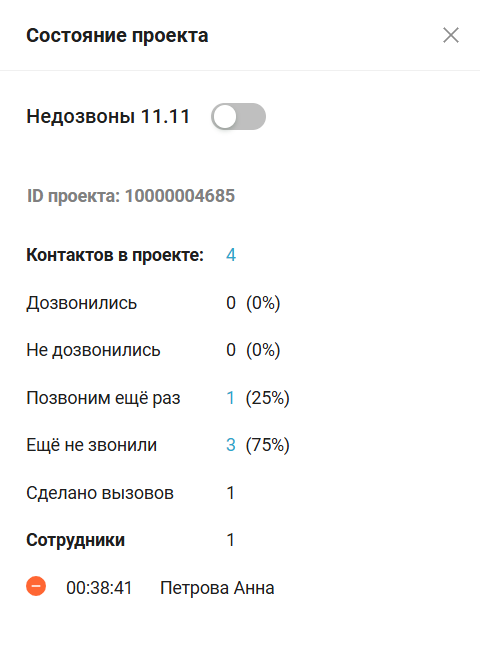 - Звонок по проекту — автоматический звонок длительностью от 1 секунды, совершенный в рамках обзвона по проекту.