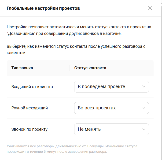 Важно! Изменение настроек применяется сразу для всех типов звонков, а смена состояния контакта в проекте не отображается в карточке. Не рекомендуем часто менять глобальные настройки проектов во избежание спорных моментов в логике обзвона.