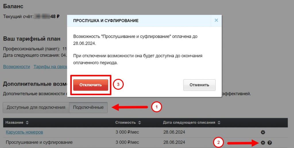 Перейдите в раздел с дополнительными возможностями «Баланс» → «Тариф и возможности». Нажмите «Подключить» и отправьте заявку на подключение суфлирования и прослушивания.