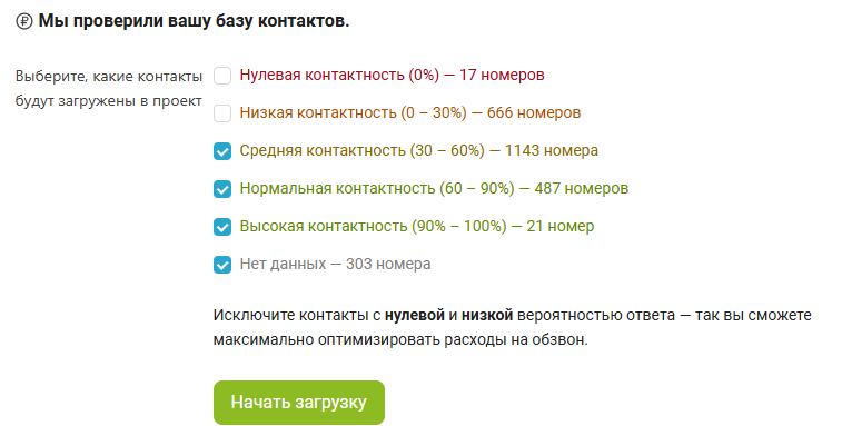 Новый инструмент в сервисе, который оценивает вероятность дозвона до каждого номера и помогает исключить тех, кто, скорее всего, не возьмёт трубку. Вы можете звонить только целевым контактам. Таким образом вы экономите до 45% бюджета на МАВ и маркировке.