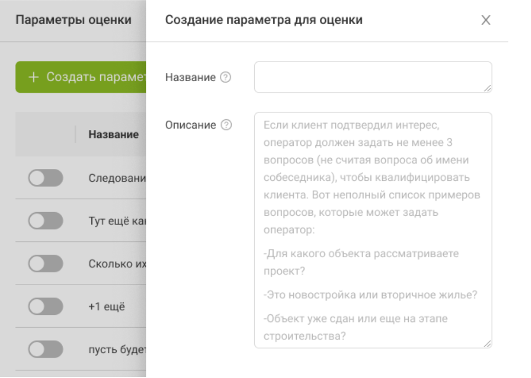 Добавили возможность создавать собственные параметры оценки и использовать их в сценариях тренировок (с общим лимитом до 8 параметров). Кастомные критерии участвуют в расчёте итоговой оценки, отображаются в отчётах. Их можно скрыть или удалить без потери истории.
