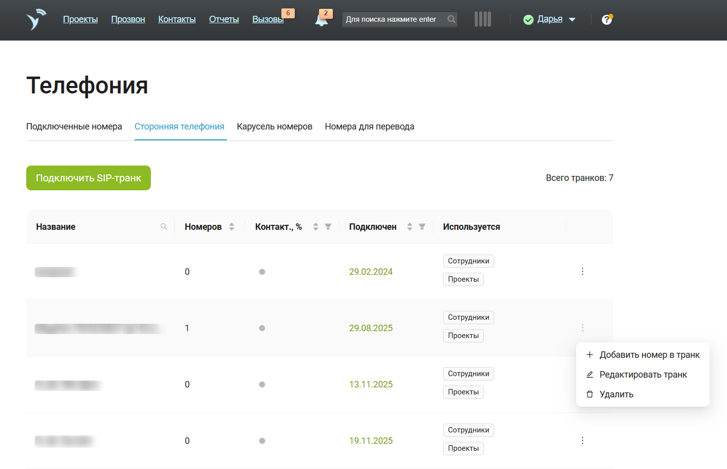 Предусмотрена защита от ошибок: если номера из транка уже используются в проектах, удалить такой транк не получится.