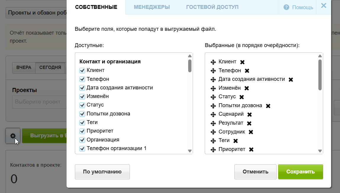 В отчёт «Проекты и обзвон роботом» добавили меню настроек. Теперь можно самостоятельно выбирать нужные колонки для составления отчёта.